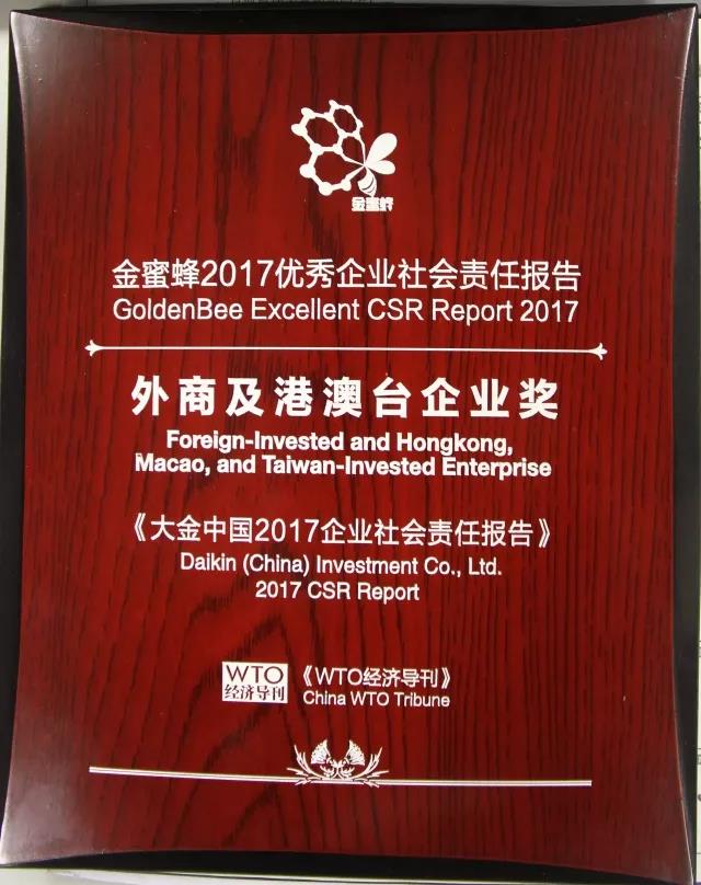 12月1日,由《WTO經(jīng)濟(jì)導(dǎo)刊》舉辦的第十屆中國企業(yè)社會(huì)責(zé)任報(bào)告國際研討會(huì)在北京舉行。《大金中國2017社會(huì)責(zé)任報(bào)告》獲得“金蜜蜂2017優(yōu)秀企業(yè)社會(huì)責(zé)任報(bào)告外商及港澳臺(tái)?企業(yè)獎(jiǎng)”。